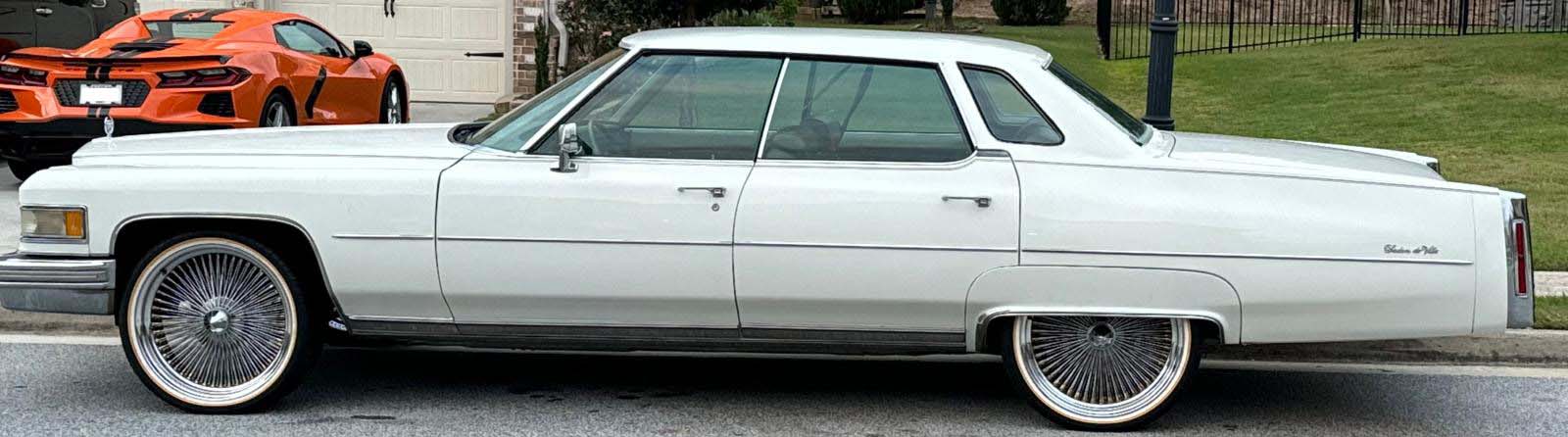 This 1975 Sedan DeVille reflects peak full-size Cadillac comfort. Classic white paint emphasizes length, chrome, and formal rooflines. Power comes from a 472 or 500 cubic inch Cadillac V8 paired with a Turbo-Hydramatic transmission, focused on smooth, isolated ride quality.