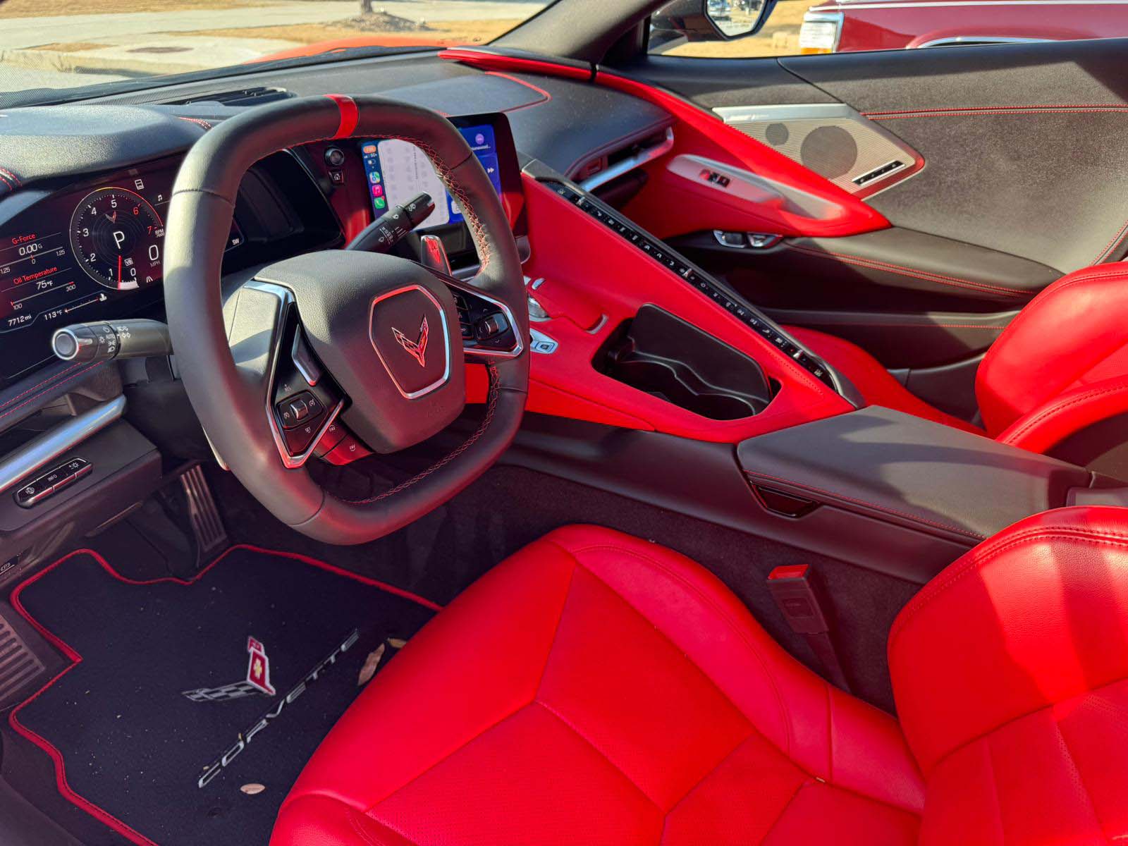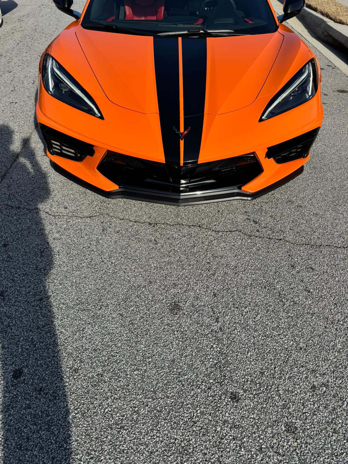 This 2023 Corvette showcases modern American performance with dramatic mid-engine proportions. Classic orange paint highlights sculpted aerodynamics. Power comes from a mid-mounted V8 paired with a dual-clutch automatic transmission.